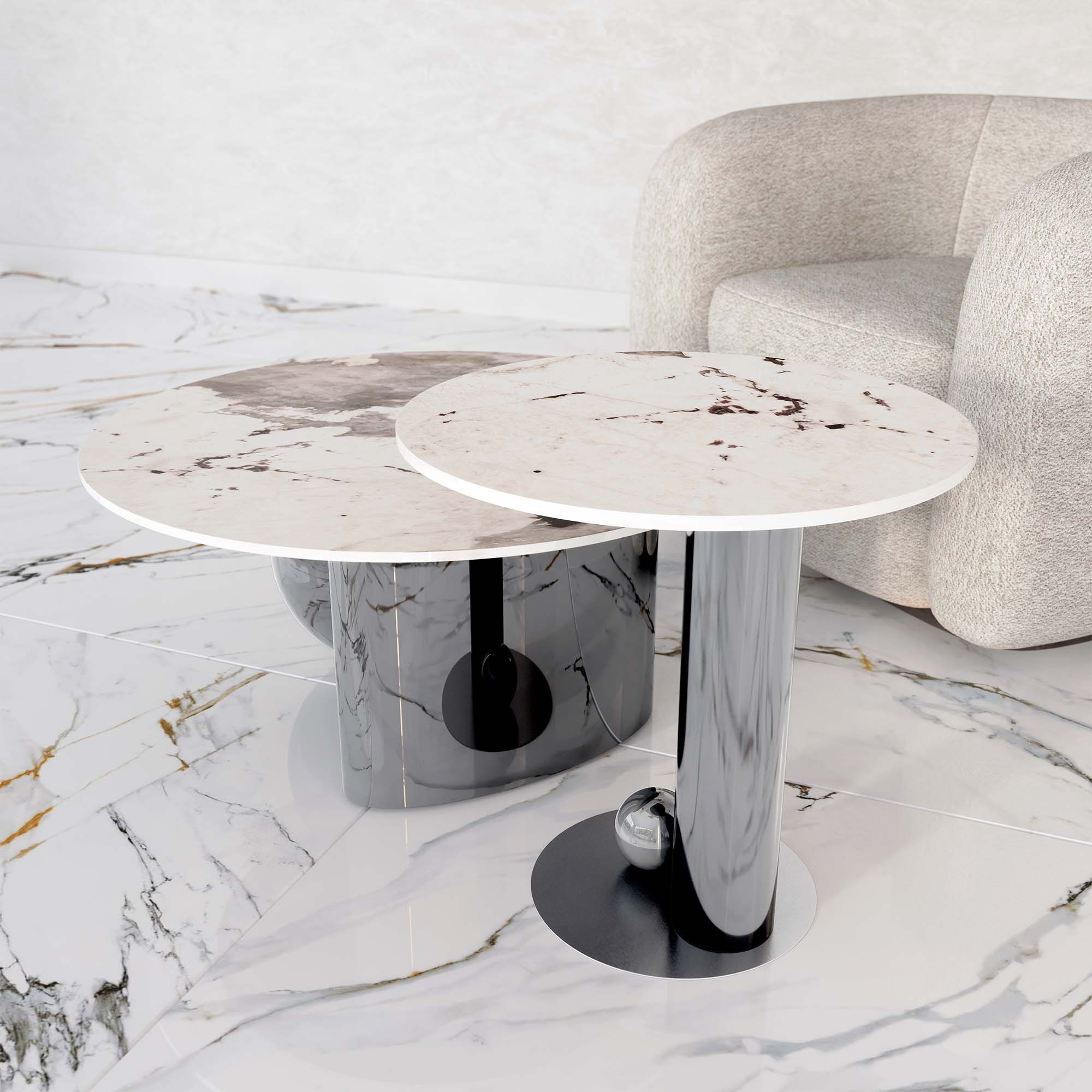Ce qui rend la table basse Parigi encore plus spéciale, ce sont les bases, leurs formes si différentes de l'habituelle, réalisé en acier inoxydable miroir noir.